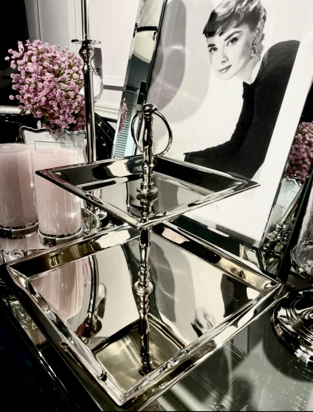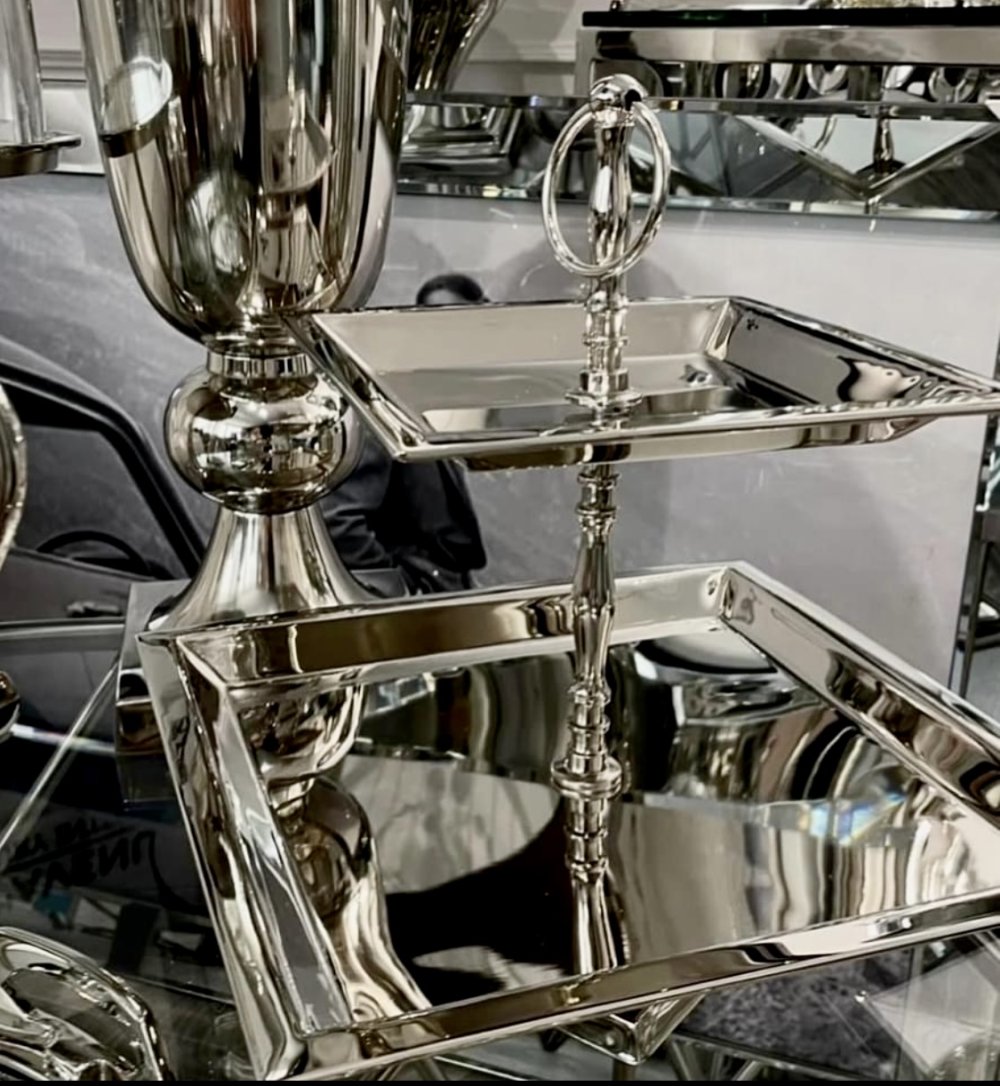Elegancka 2- pietrowa etażerka SQUARE z metalu , pokryta niklem . Idealnie wpasowywuje się we wnetrza klasyczne i nowoczesne .