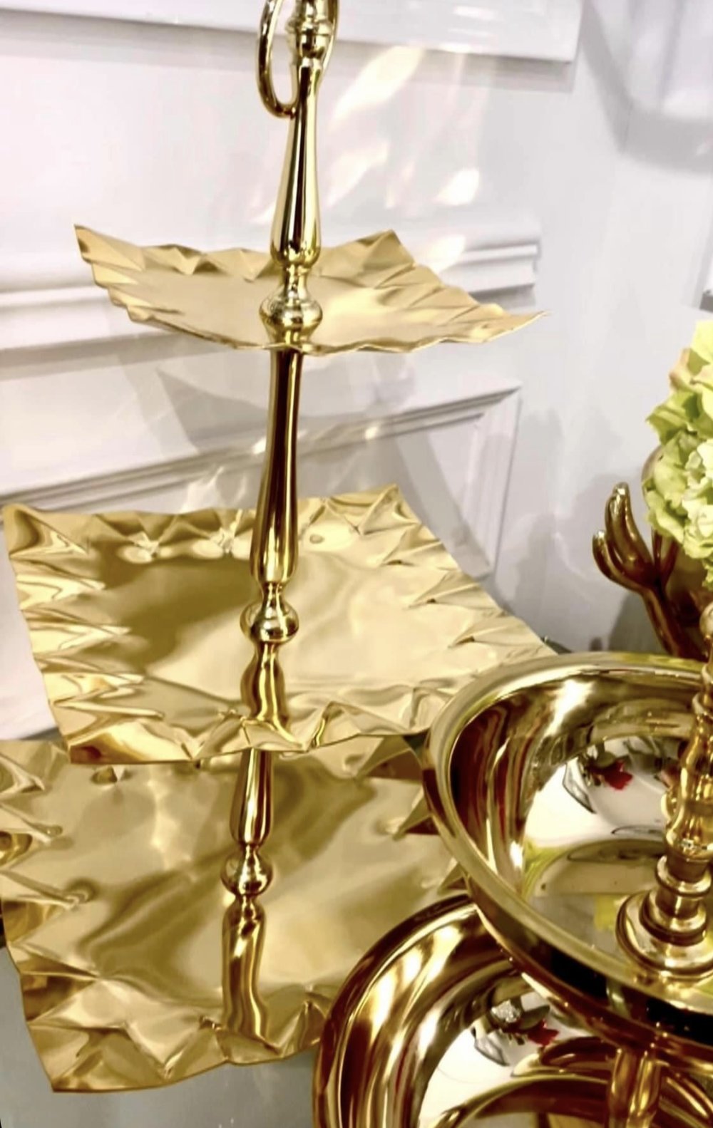 Złota 3 – pietrowa etazerka . Karbowane talerze. Delikatna i elegancka . Idealnie sprawdzi się na ciasto .